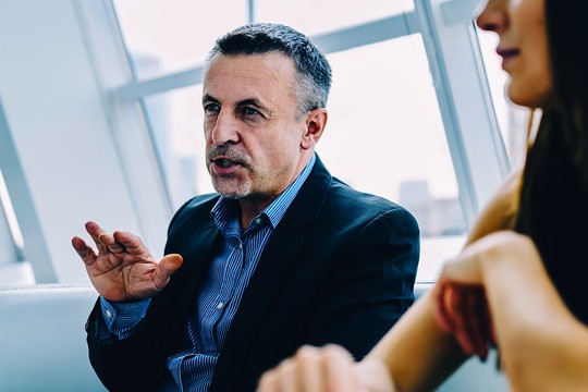 • A man in a light sweater gestures animatedly while speaking, holding a pen, as he engages with another person in a bright, modern office setting with large windows.