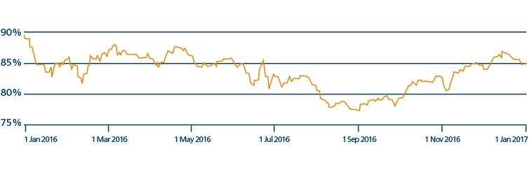 The chart above, from our interactive tracker Illuminate, shows how the IAS19 funding position for a typical defined benefit pension scheme has played out over the year. Starting the year at 90%, it has never recovered above this point. Whilst higher than the lows seen at the end of August our typical scheme is still only 85% funded at the year end, 5% down on the start of the year, even though the FTSE 100 total return index was up 19% over the year.