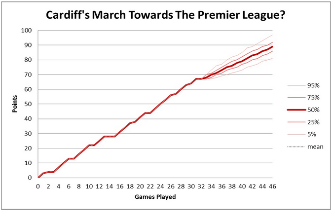 Our stochastic model forecasts the result of every match from then to the end of the season. This allowed us to predict what the table would look like at any date and plot our expected path for each club.