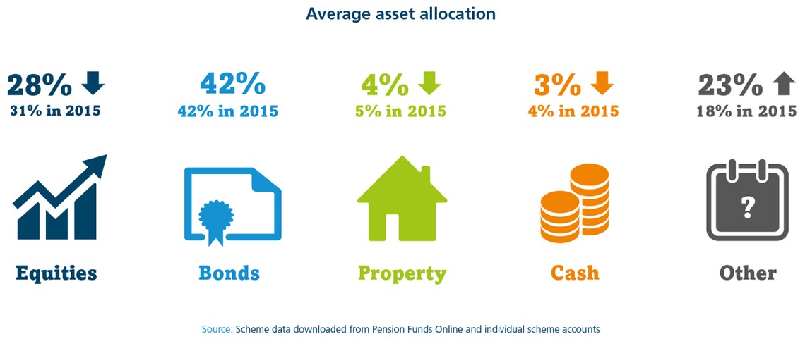 The Pensions Regulator is encouraging schemes to ensure that their investment strategy remains appropriate as their active membership falls. The big schemes’ allocation to equities has fallen slightly over the year, our survey shows, with a corresponding increase in the allocation to 'other' investments. This includes pooled investment vehicles and alternative asset classes, such as derivatives. This may reflect the increase in popularity of liability-investment strategies for maturing schemes.