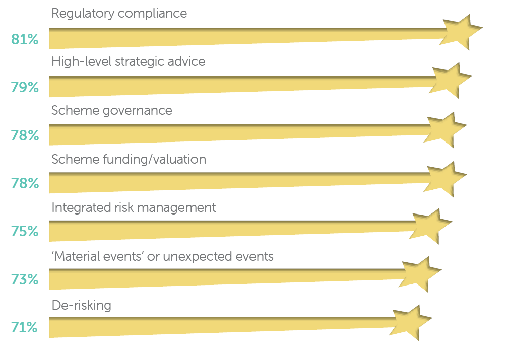 Pleasingly, it shows high scores for both “big picture” advice (such as high-level strategic advice) as well as getting the detail right (such as regulatory compliance). It also shows good scores for both traditional work (such as scheme funding) as well as more contemporary work (such as de-risking).