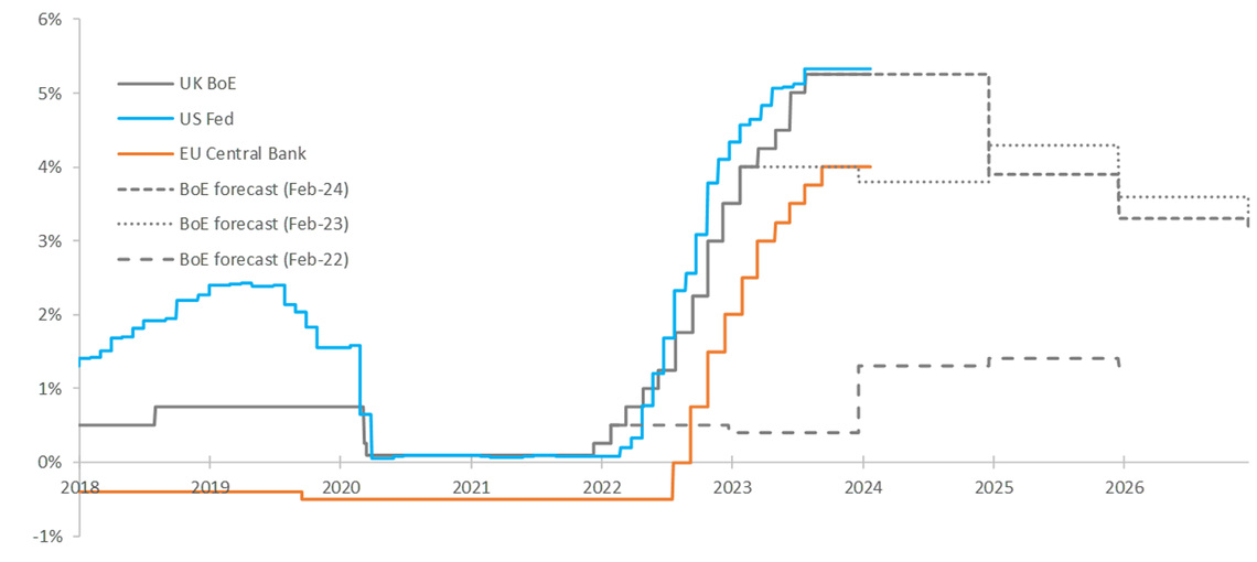 The graph shows the UK, US and EU interest rates and associated Bank of England projections. It demonstrates how difficult it has been for even those in charge of monetary policy to forecast where rates will go next, noting the findings of the Bernanke review.