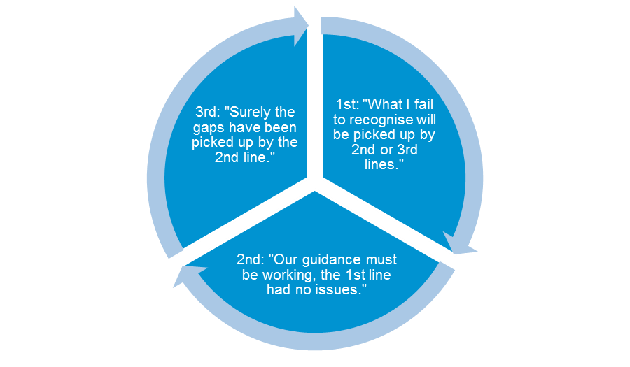 Human nature can be a downfall in the three lines mechanism. It is easy for people to become complacent. Imagine if the lines took this attitude: