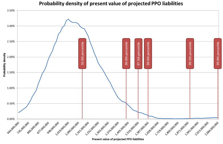 PPOs are very sensitive to the longevity risk inherent in them and so longevity risk is a good candidate to be modelled stochastically. Whilst there is very limited historical data on PPOs to set longevity assumptions, there is a lot of data and research available on the underlying shapes and patterns of mortality that you can combine with your historical experience to set your assumption and measure your uncertainty in it.