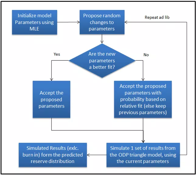 The feature that sets Markov Chain Monte Carlo methods apart from other stochastic methods is that the parameters that define the distributions for incremental claims in the model are not estimated or sampled directly. Instead, the parameters themselves are randomly varied between simulations to reflect the parameter variance.