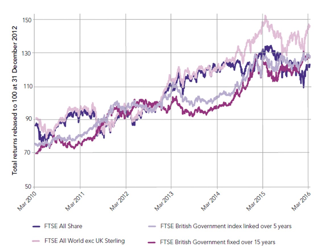 Index-linked gilts would have returned around 21% over the three years to 31 December 2015, and around 18% over the three years to 31 March 2016.