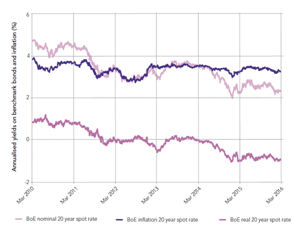 Market yields on government bonds are key indicators used to set assumptions for future investment returns – particularly as they are indicative of the market’s view of a (relatively) ‘risk-free’ rate of return.  There was a significant fall in gilt yields towards the end of 2014, and the position has not significantly improved since then.  As a result TPR expects that, all else being equal, schemes will use lower asset return assumptions than their previous valuation.
