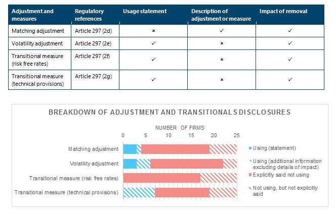 Potentially confusingly, the Solvency II delegated acts require firms to state whether they are using the volatility adjustment, but not the matching adjustment. The majority of firms appear to have played it safe by including a statement for both adjustments, although 3 firms failed to comment on whether they were using a volatility adjustment.