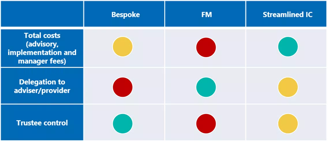 For trustees looking to ease the burden, we see two main alternatives to the bespoke advisory model: