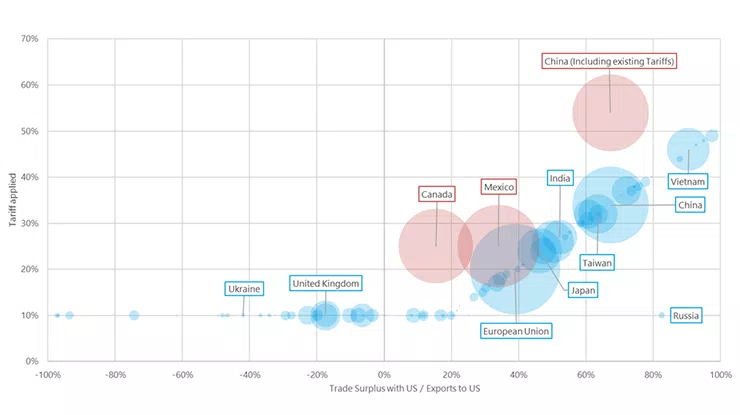 Figure 2: Tariff applied by country relative to trade surplus with US. Size of bubble reflect size of exports to US