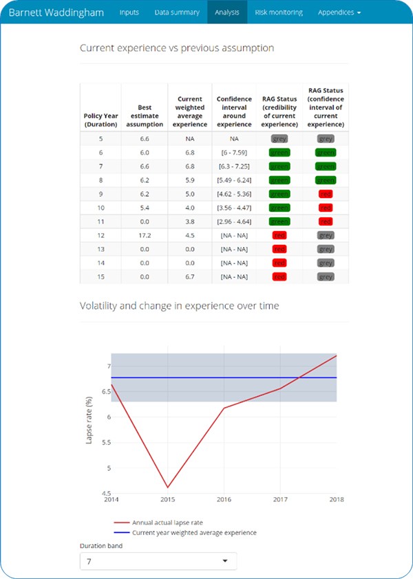 The tools produce tables showing experience compared to the most recent (or proposed) best estimate assumptions. RAG statuses based on statistical tests quickly show us where focus is needed in the assumption setting process.