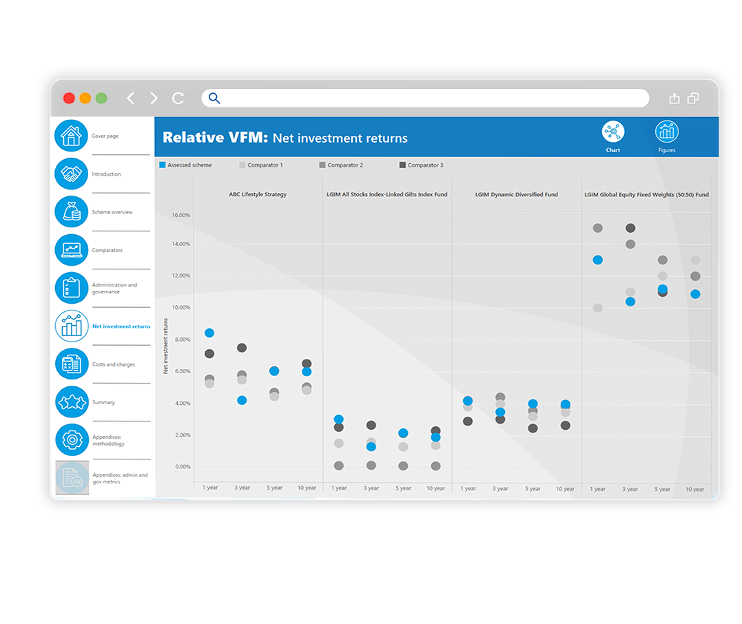 Provides reporting on the investment strategy design, risk adjusted performance, ESG both in absolute and relative terms. Our reporting provides comparative performance against the market and bespoke benchmarks to ensure performance is assessed without bias.