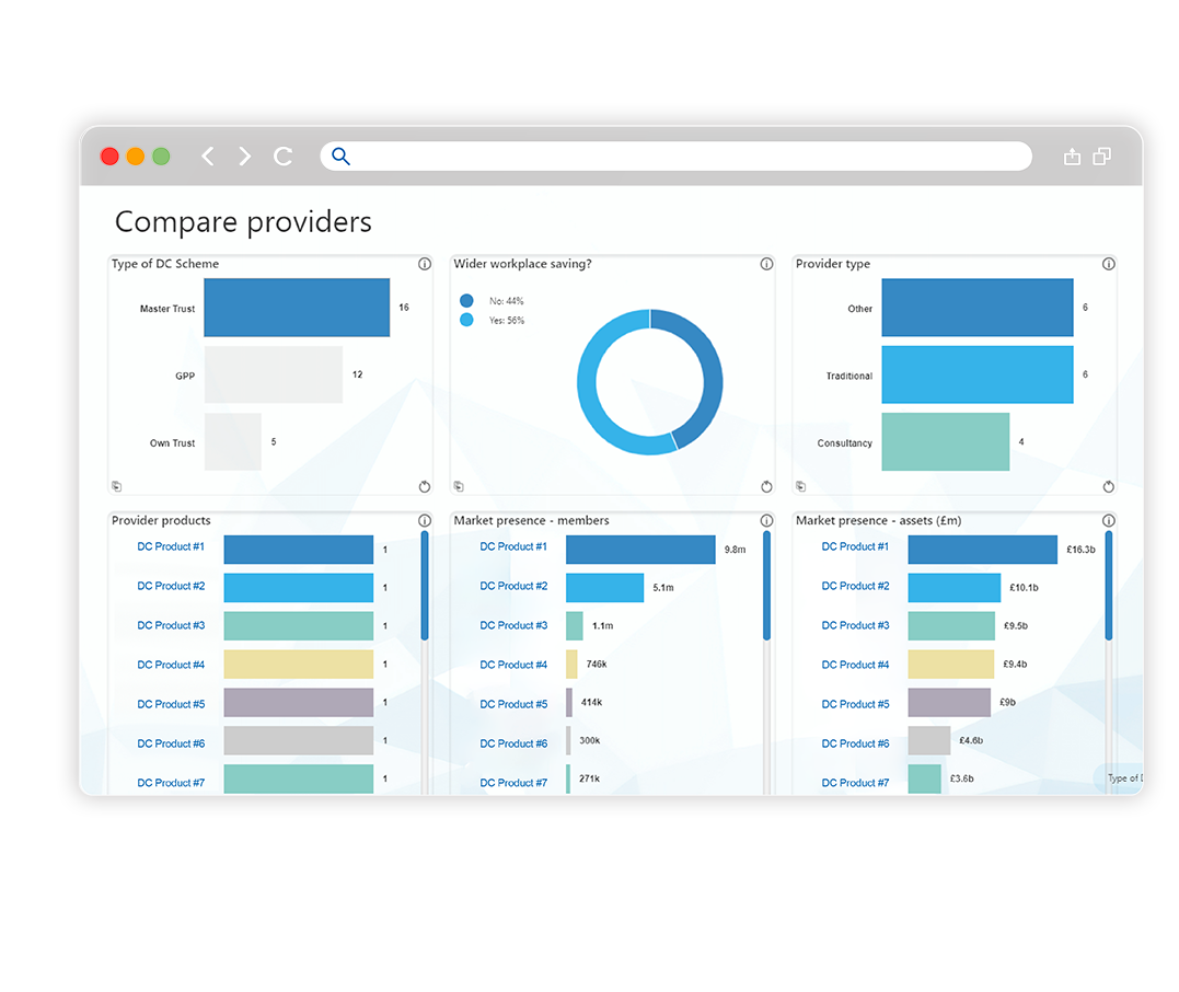 Allows us to provide real time comparisons of pension arrangements based on our independent research, client experience and commercial terms, weighted to client specific key areas.